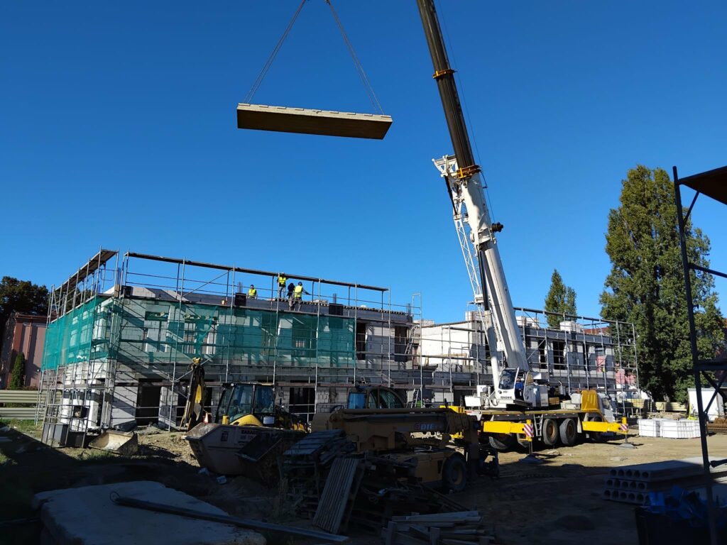 Prace budowlane przy ul. Chopina w Gorzowie Wlkp. przebiegają zgodnie z harmonogramem. Zakończono montaż płyt stropowych nad parterem, a obecnie trwa układanie płyt kanałowych na